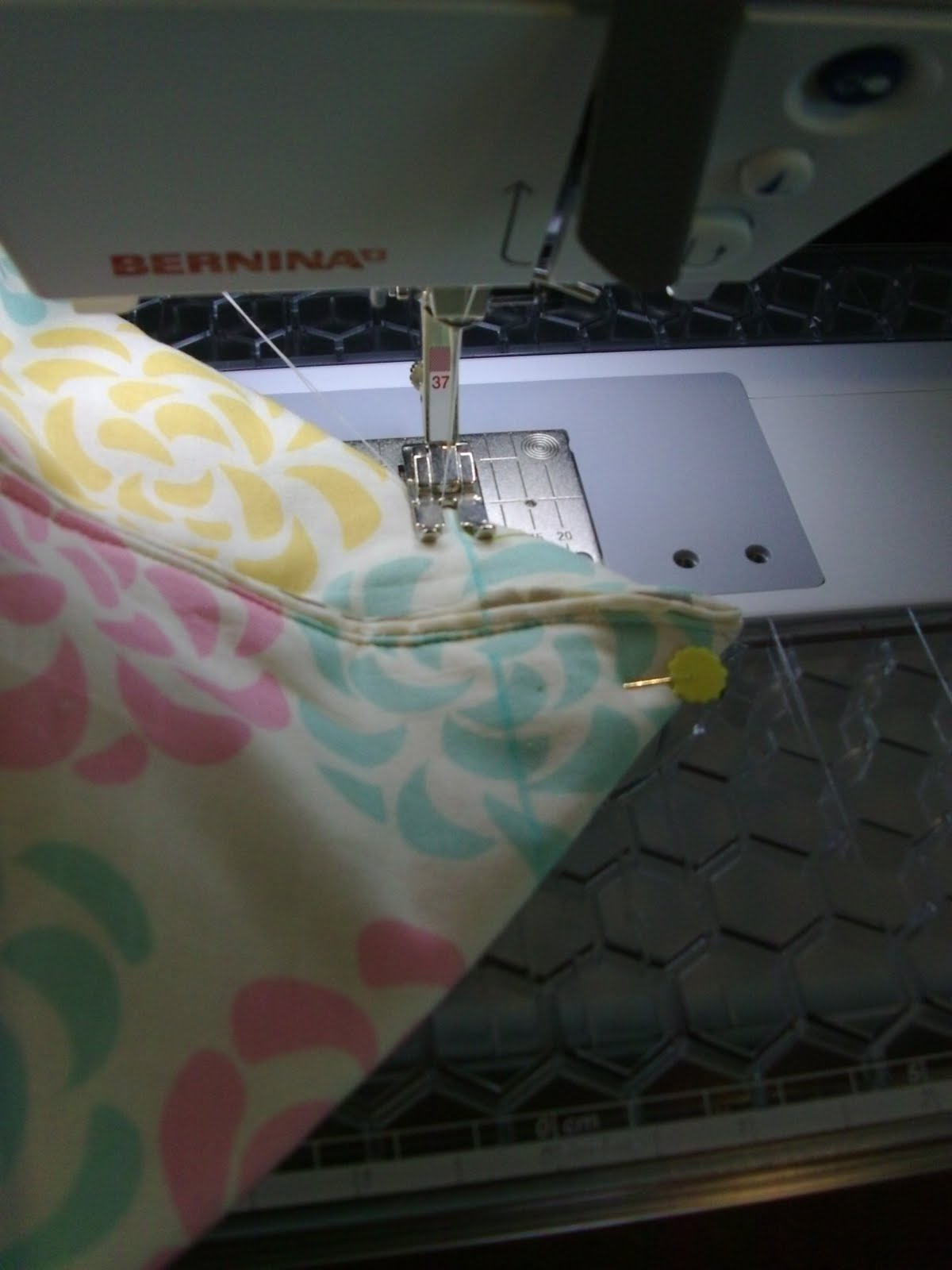 6. De seguida abra os cantos de um lado e de outro e marque uma linha à distância de 1,5" do bico. Cosa por cima dessa linha, reforçando no princípio e no fim.