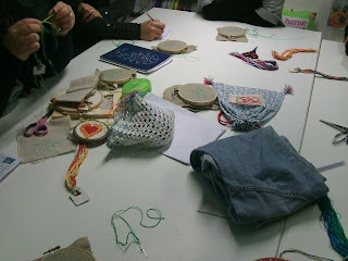Para além de muitos adultos tivemos duas meninas de 8 anos a fazer os bordados e é preciso dizer que aprenderam muito mais depressa que qualquer outra pessoa! A Maria foi mesmo a primeira a acabar!
